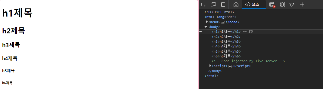 제목을 나타내는 태그입니다. <h1>부터 <h6>까지 있고 h1이 가장 중요도가 높은 제목으로 설정하면 됩니다.